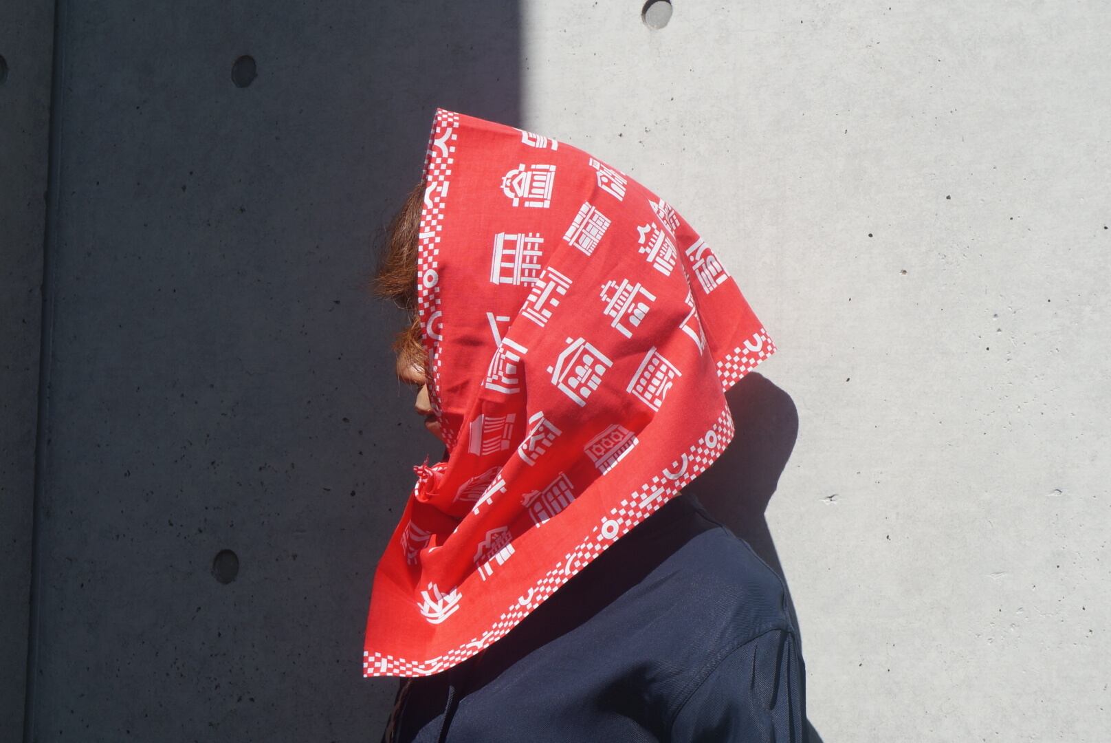 ひとつひとつの建物をアイコンとして描き並べたオリジナル手拭いです。